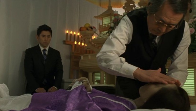 However, despite the importance of death rituals in Japanese culture, the subject is considered “unclean” as everything related to death is thought to be a source of “kegare” (defilement). This is the contradiction at the core of Departures: a job which is so vital and dealing with something so universal, yet those who perform it are scorned upon and discriminated against. Daigo Kobayashi (Masahiro Motoki) is only one of three employees at the encoffining company NK Agent, alongside his world-weary Freudian father-figure boss Ikeui (Tsutomu Yamazaki) and the secretary Yuriko (Kimiko Uemura), whom is herself a social outcast. Daigo is even openly insulted by a patron during an encoffining ceremony, while an old friend, Yamashita (Tetta Sugimoto), highly chastises Daigo upon learning of his profession. Well, that is until his own mother dies and he receives a metaphorical comeuppance. This discriminatory treatment reaches its zenith when Daigo’s Mika (Ryoko Hirosue) wife, temporarily leaves him upon discovering what he does. From an outsider’s cultural perspective, it’s hard not to feel that the reactions Daigo receives are anything but unreasonable (but I understand that I come from a particular perspective).