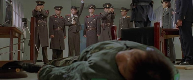 The middle portion of JSA pivots to a lengthy flashback, as two South Korean soldiers (Lee Byung-hun and Kim Tae-woo) come to befriend several soldiers from the North and start crossing the border every night simply to hang out with them. The bromance they share becomes endearing as they share southern contraband, including pop music tapes, cookies and Choco Pies, while also engaging in male bonding behaviour: looking at nudie mags, cracking jokes, giving playful jabs at each other and at one point, giving a fart as a present. There is still a real cinematic nature to these intimate moments, such as the use of two 360-degree shots during conversation, with Song Kang-ho delivering the standout performance among the soldiers as the North Korean Sgt. Oh Kyeong-pil, the domineering and alpha personality of the group. Joint Security Area was filmed on a mass recreation of the DMZ, and the sets never feel inauthentic and look indistinguishable from the real thing. I recommend watching the making-of documentary for JSA (included in the Arrow Blu-ray release) in which one of the film’s costume designers states that just a few years prior to the film’s production, he may have been breaking South Korean law by recreating North Korean military uniforms.
