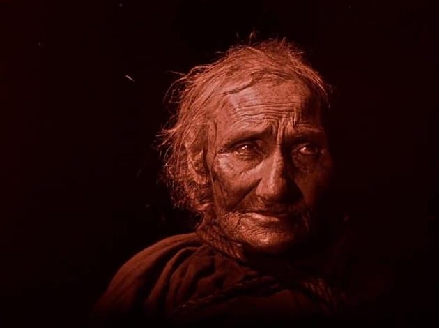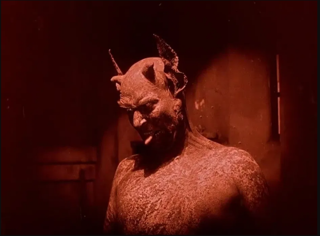 Häxan has all the ingredients you would want from a 100+ year old, arcane, European movie. The sepia tinting, eerie music, haunting choirs, the sight of animal skulls and skeletons in the witch’s dwelling and even the Swedish title cards make it feel all the more unnerving and atmospheric. Likewise, during the trial section of the film (chapters 3 and 4), the close-up shots of the old woman’s face as she is forced to deal with Church inquisitors feel reminiscent of what would later be accomplished in The Passion of Joan of Arc (1928). The lady in question during these scenes, Maren Pedersen (as Maria the Weaver), in her only screen credit, was born in the year 1842. It’s amazing, penetrating close-up into the face of a woman whose birth predates the existence of cinema by decades. Häxan also features scenes with Satan himself (played by the director, Benjamin Christensen), as he gleefully shows off his forked tongue. Over the years, I have kept seeing this as an image of ridicule and parody; thus, my instant reaction when seeing it is to laugh. Likewise, as far as the more immature 12-year-old in me goes, many viewers may also be humoured to see the end credits card.
