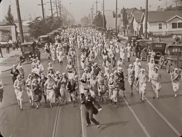 As Jimmie becomes increasingly desperate to find a bride he runs up towards a woman only to see that she is black. Now keep in mind that miscegenation was illegal in California until 1948. Is Jimmie showing repulsion over her race or disappointment that he legally cannot marry her? The gag could be interpreted as a jab at such laws however at least one black woman does come to the church later on to marry him. Subsequently, Jimmie approaches another woman only to stop pursuing her upon discovering she is Jewish after she holds up a newspaper in Yiddish. Many reviewers mistake the newspaper to be printed in Hebrew which was not a widely spoken language among Jews at the time whereas Yiddish was (several newspapers in this language did exist in the US at the time and I’m curious as to what the text on the paper translates to). It’s not clear if the girl even speaks English as when Jimmie speaks to her she looks confused and just shrugs her shoulders. Does Jimmie avoid marrying her due to language barriers, the issues derived from marrying a Jewish woman or just anti-Semitism on his part (to derive some humour from shock value)? Likewise, another woman Jimmie encounters gives him a quick rejection to which he informs his partners immediately afterwards, “Wrong party” – make of that what you will. The only joke in the film in which context is required for a modern viewer is that in which Jimmie walks into a theatre featuring what appears to be a female performer, only for him to walk out seconds later in a ruffled-up state upon discovering the performer in question is Julian Eltinge, a cross-dressing performer of the time. I will say it is the weakest gag in the film as it’s not particularly clever.